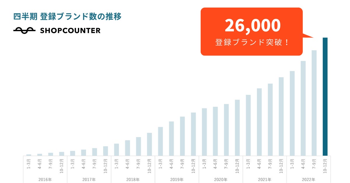 利用登録者数も前年同期比(21年10-12月比較)で1.5倍に増加し、累計ブランド登録数も2.6万となりました。2015年5月のサービス開始から約5年となる2020年7月に1万を突破、そこから1年8ヶ月を経て22年3月に2万を突破し、23年3月頃には3万を超える見込みと、ユーザーの増加ペースは急速に上がっております。