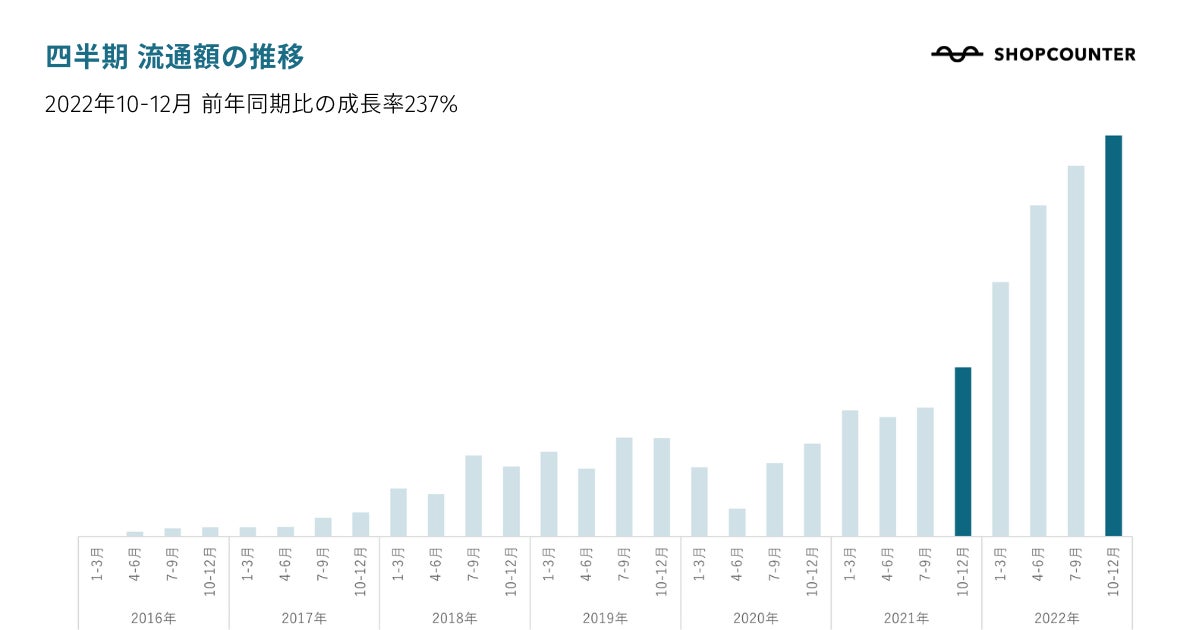 その結果、プラットフォームを通じて行われた決済金額の総和となる流通額(GMV)は前年同期比(21年10-12月)で237%の成長を果たすことができました。