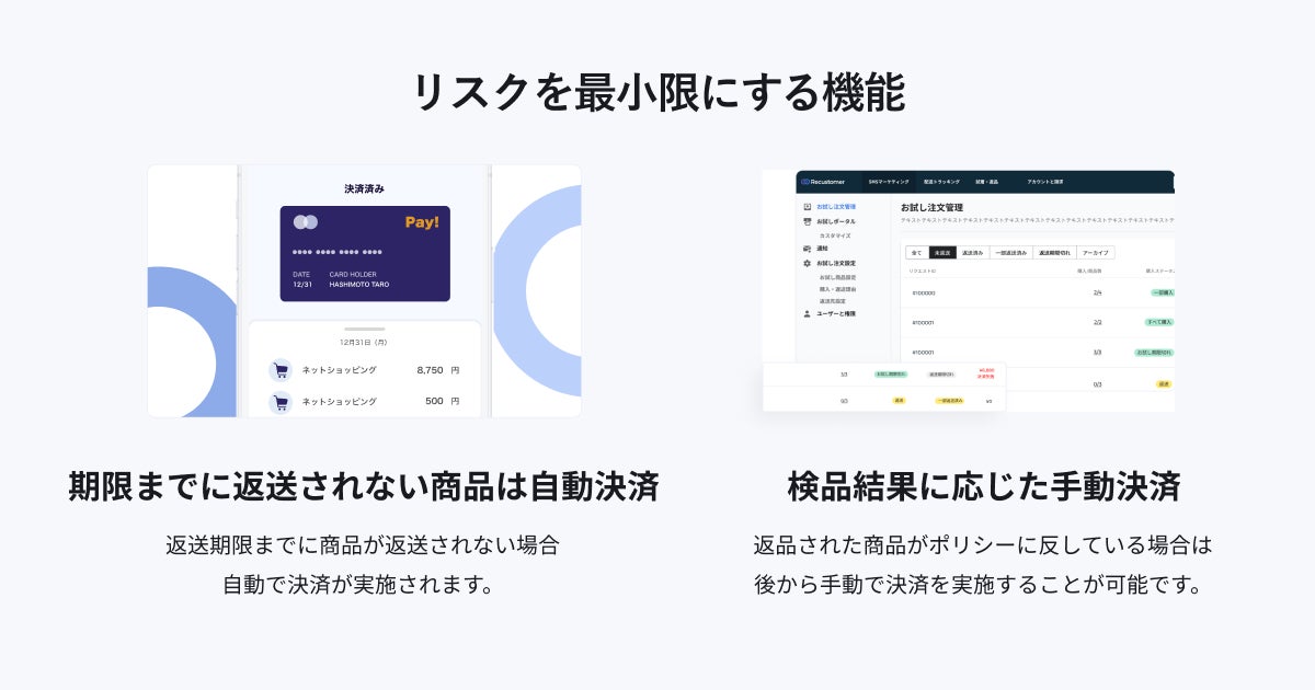 具体的には、事業者が定めた期限までに、買い物客からの返送が行われなかった商品に対し、自動で決済をかける機能や、返送された商品の検品結果がポリシーに反する場合に事業者が手動決済を行える機能です。