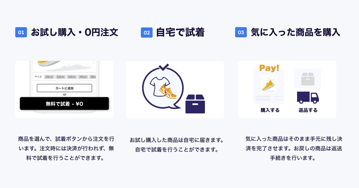 試着時は0円で注文を行え、商品が届き試着をした後、購入しない商品は返送、購入を決定した商品分の金額を自動決済します。