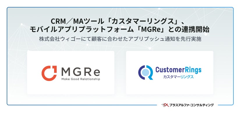 株式会社プラスアルファ・コンサルティング(本社:東京都港区、代表取締役社長:三室克哉、証券コード:4071)の提供するCRM/MAツール「カスタマーリングス」は、メグリ株式会社(本社:東京都中央区、代表取締役:田代健太郎)が提供するアプリマーケティングプラットフォーム「MGRe(メグリ)」との連携を開始しましたのでお知らせいたします。これにより、更なるCX(顧客体験)向上を支援する機能の提供が可能となりました。