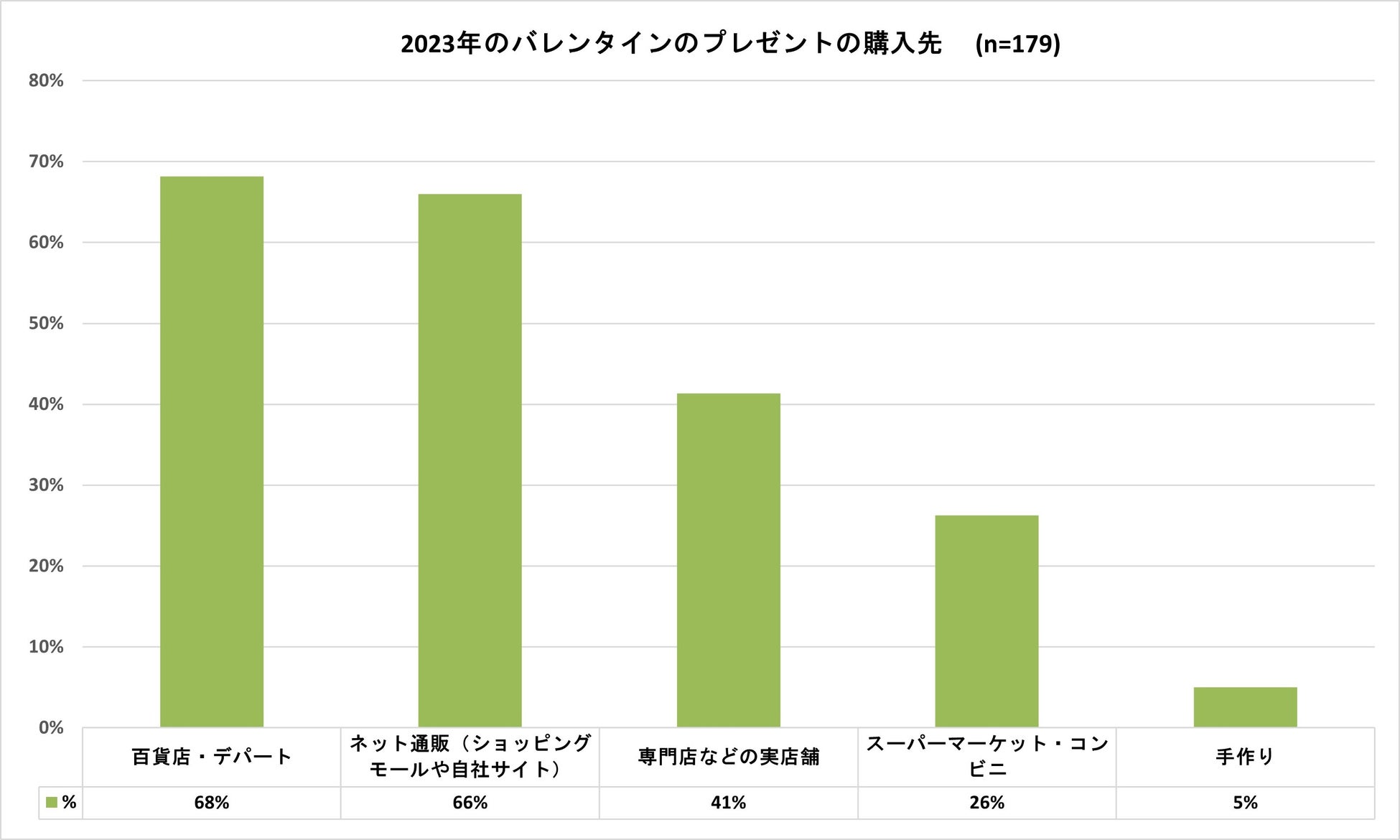 バレンタインのプレゼントの購入先の上位は百貨店やデパートが68%、ネット通販が66%となりました。ネット通販選択理由としては、多種多様なラインナップや利便性があげられています。