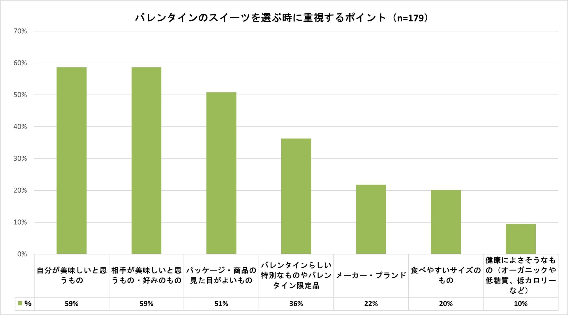 バレンタインのスイーツ選びにおいて、自分や相手の好みのものが最多になりました。また、パッケージなどの見た目や限定品も上位になっていることから、味だけではなく特別感もポイントになっています。