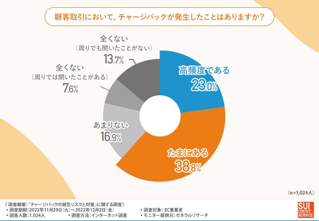 「顧客取引において、チャージバックが発生したことはありますか?」と質問したところ、6割以上の方が『高頻度である(23.0%)』『たまにある(38.8%)』と回答しました。
