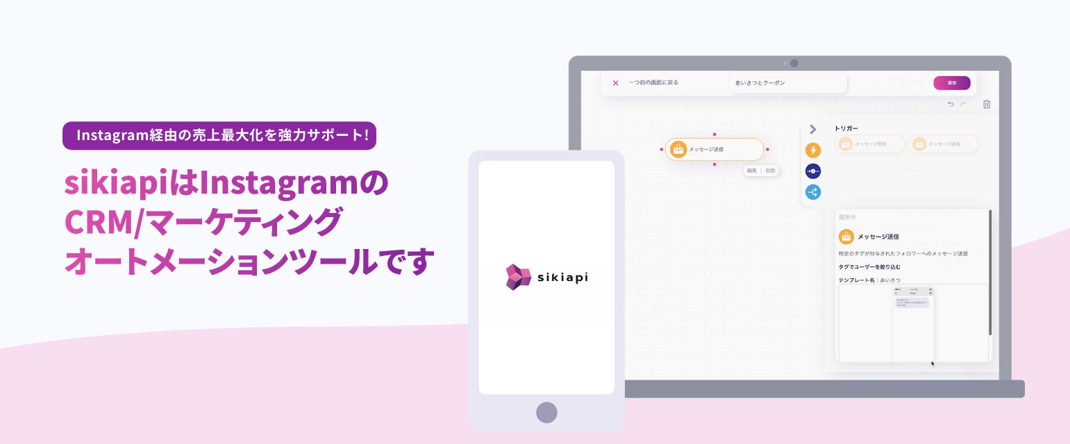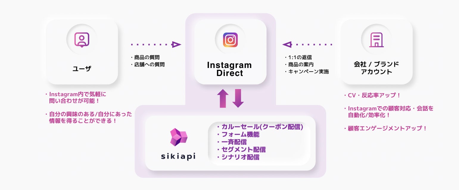 株式会社Enigol(本社:東京都港区、代表取締役社長:柳沢 智紀)は、InstagramのCRMとマーケティングオートメーションを実現する対話型マーケティングツール「sikiapi(シキアピ)」のβ版の提供を開始しました。これまでSNSのCRMツールと言えば、LINE公式アカウントが主流でしたが、sikiapiにより、InstagramのDMを活用した顧客対応やセグメント配信、キャンペーンのクーポン配信など、顧客それぞれの興味関心に沿ったCRMが可能になります。視覚的情報の発信を特徴とし、認知から購買行動に結びつきやすいInstagramのカスタマーサクセスの向上と、売上最大化をサポートします。