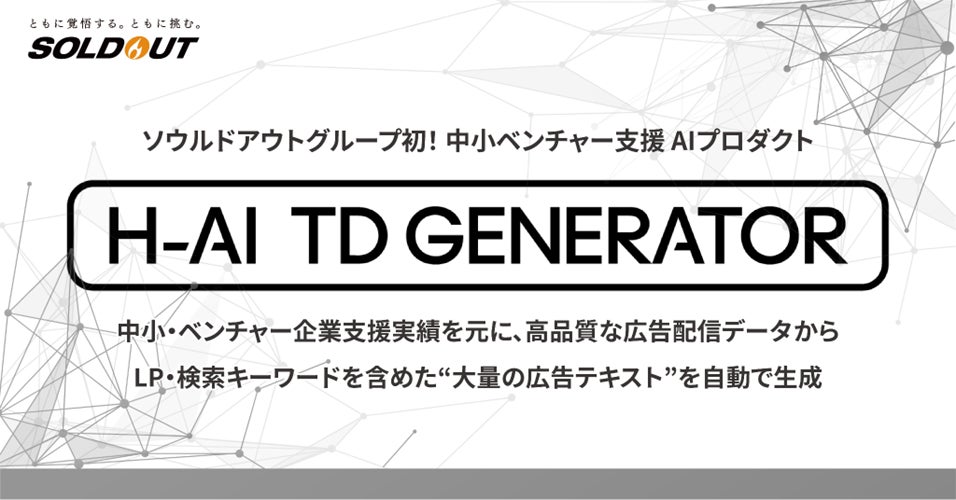 地方を含む日本全国の中小・ベンチャー企業の成長支援をデジタルマーケティング領域で展開するソウルドアウト株式会社(本社:東京都文京区 代表取締役社長CEO兼CCO:荒波修、以下「ソウルドアウト」)は、2023年1月より、成果につながる高品質な広告を顧客に対してより素早く納品可能にする広告成果支援プロダクト「H-AI TD GENERATOR (エイチエーアイ・ティーディー・ジェネレーター)」の提供を開始いたします。本プロダクトは、広告文自動生成AIを用いてweb広告の広告文をキーワードごとに大量に生成することが可能なツールとなります。