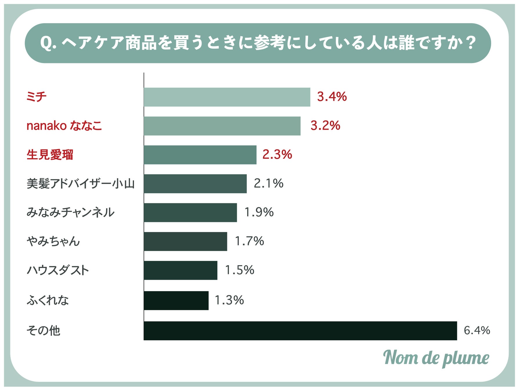 アンケートにて「ヘアケア商品を買うときに参考にしている人は誰ですか?(自由回答)」と尋ねたところ、『ミチ(3.4%)』と答えたZ世代が最も多く、続いて『nanako ななこ(3.2%)』『生見愛瑠(2.3%)』が多い結果となりました。3人ともに髪に強いこだわりを持っている方で、YouTubeやSNSなどで積極的にヘアケア方法を発信していることもあり、ヘアケアに興味を持っているZ世代から支持を得ていると考えられます。