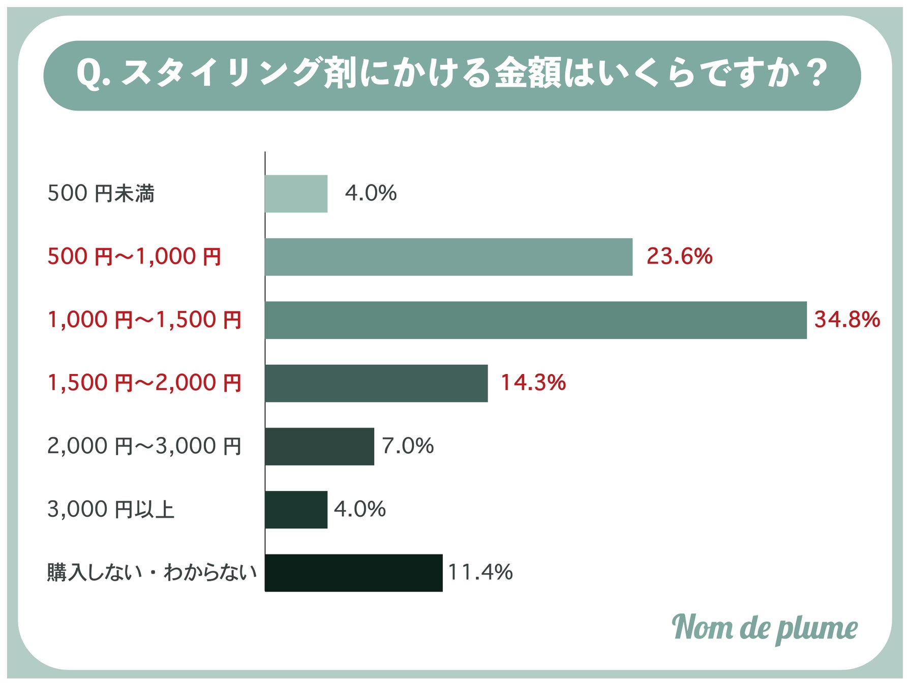 アンケートにて「スタイリング剤にかける金額はいくらですか?」と尋ねたところ、最も多かったのが『1,000円〜1,500円(34.8%)』、次いで『500〜1,000円(23.6%)』『1,500円〜2,000円(14.3%)』と続く結果となりました。