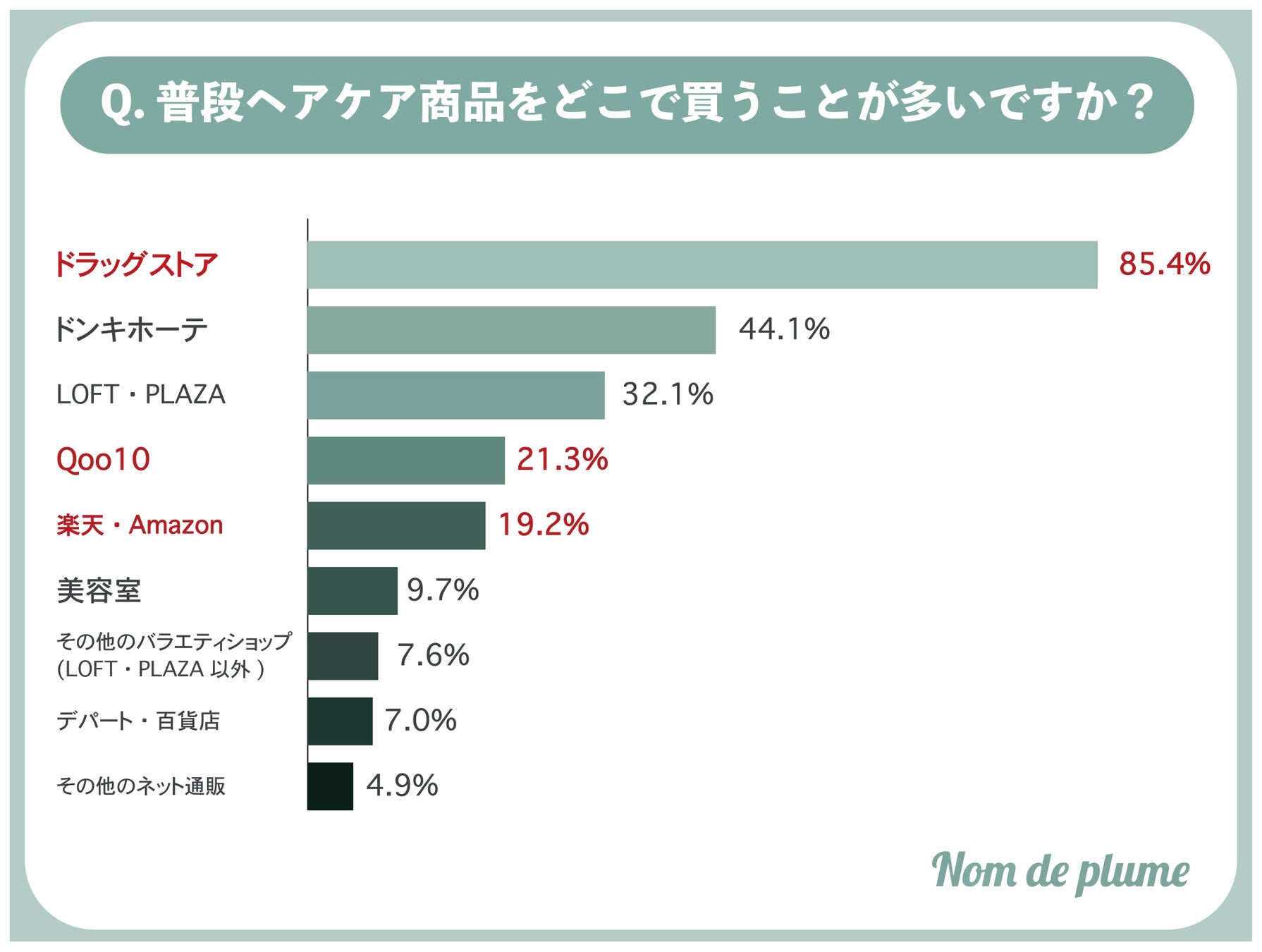 アンケートにて「普段ヘアケア商品をどこで買うことが多いですか?」と尋ねたところ、『ドラッグストア(85.4%)』と回答した方が最も多く、全体の8割を占めていました。またアンケートの結果から、『Qoo10(21.3%)』『楽天・Amazon(19.2%)』などネットから購入する方も少なくないこともわかりました。