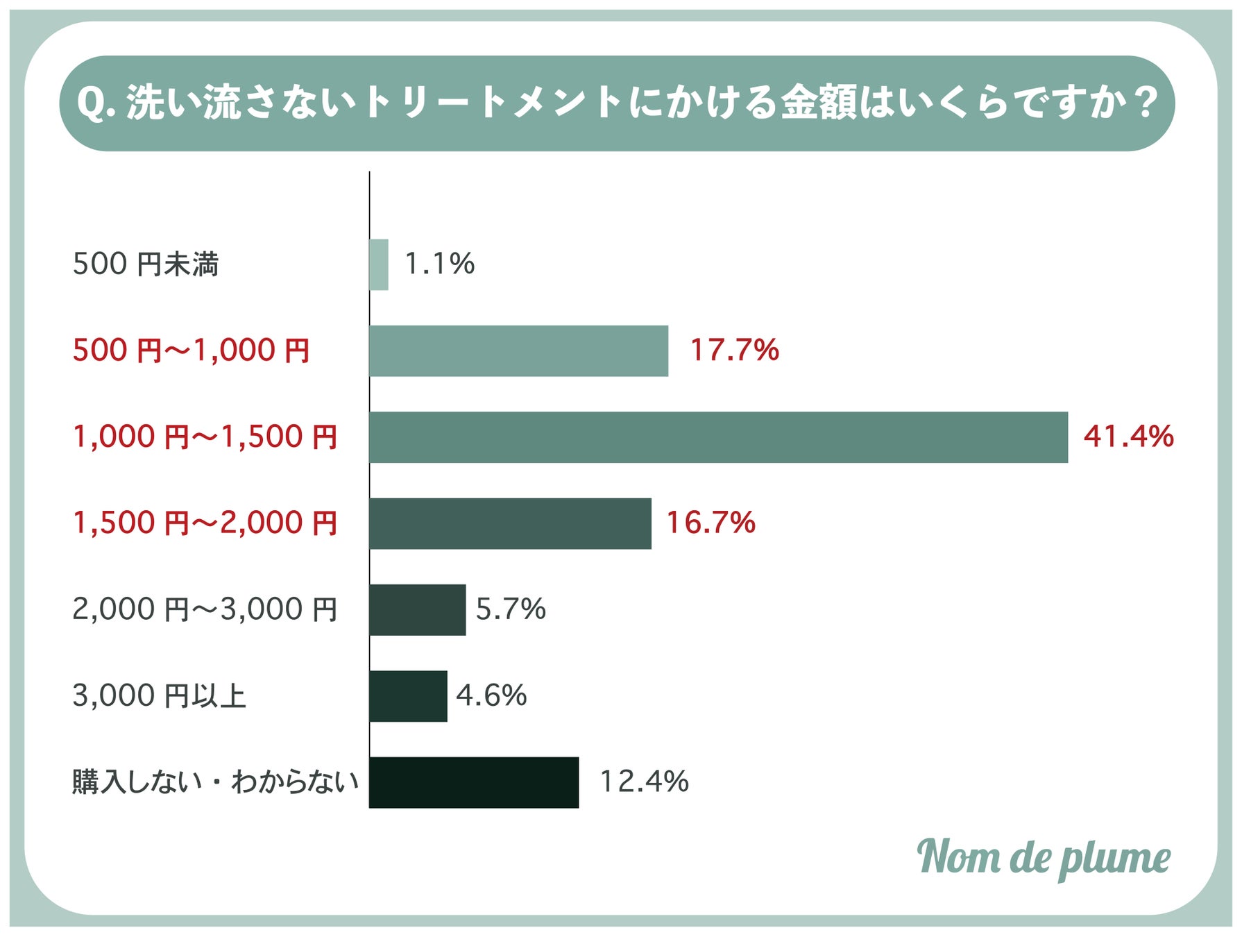 アンケートにて「洗い流さないトリートメントにかける金額はいくらですか?」と尋ねたところ、シャンプーやトリートメントにかける金額と同じく『1,000円〜1,500円(41.4%)』と回答した方が最も多く、次いで『500〜1,000円(17.7%)』『1,500円〜2,000円(16.7%)』という結果となりました。また、スペシャルケア系のトリートメントと同じく、『購入しない・わからない(12.4%)』と回答した方が全体の4番目に多い結果になりました。
