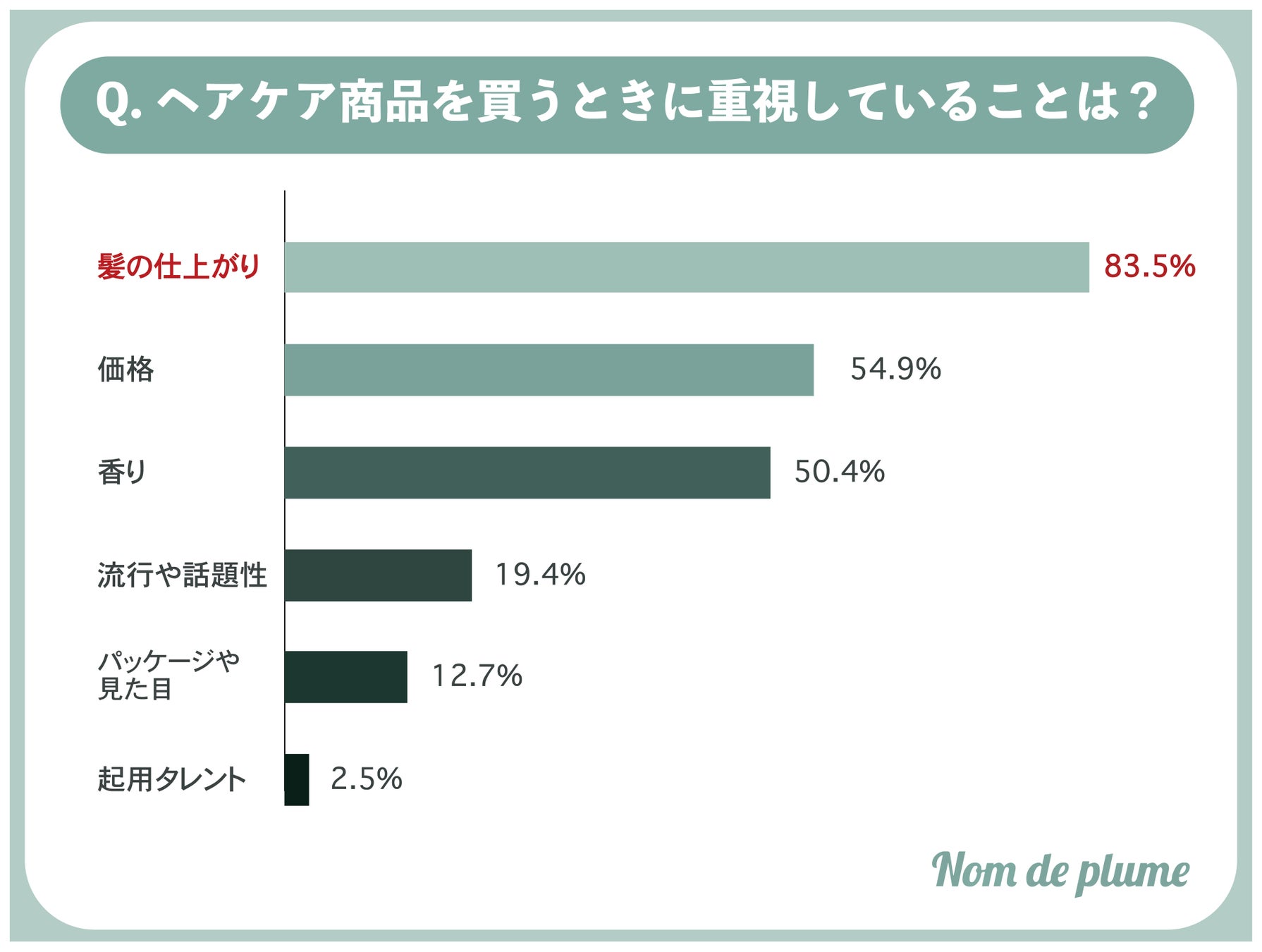 アンケートにて「ヘアケア商品を買うときに重視していることはありますか?」と尋ねたところ、『髪の仕上がり(83.5%)』と答えた方が最も多い結果となりました。アンケートに回答したZ世代からも、「何よりもゴワつきやパサつきなどの髪悩みを解決してくれているかどうかを重視してます」(23歳/大学生)という意見があり、手触りや保湿感などの仕上がりを重視する方が圧倒的に多いことから、Z世代はヘアケア商品に対して、パサつき・広がり・うねりなどの髪悩みを解決してくれることに最も期待していることが伺えます。