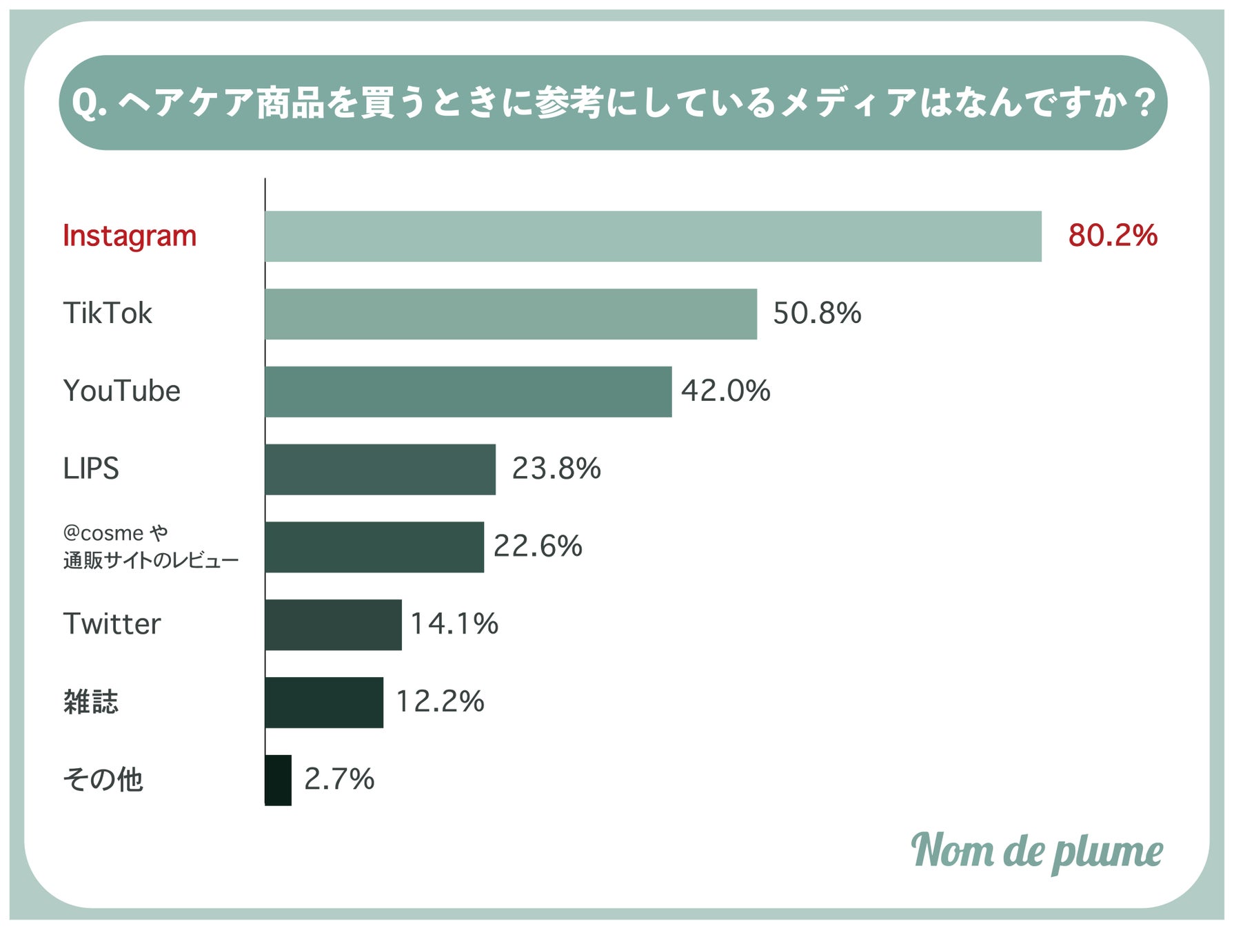 アンケートに回答したZ世代によると、「nanakoななこさんは年齢も近くてプチプラで紹介してくれることが多いので購入の参考にしていることが多いです」(23歳/社会人)といったように、インフルエンサーが手の届きやすい身近なプチプラの商品を投稿していると興味が湧きやすく、より購買意欲に繋がりやすいようです。また、他には「特定の方を参考にすることはあまりなくて、同じ髪質で悩んでいる一般人のレビューもよく参考にしています」(23歳/大学生)という声も上がっており、髪悩みは人によって異なることもあり、Z世代から参考にされる人やメディアにはバラつきが出るようでした。