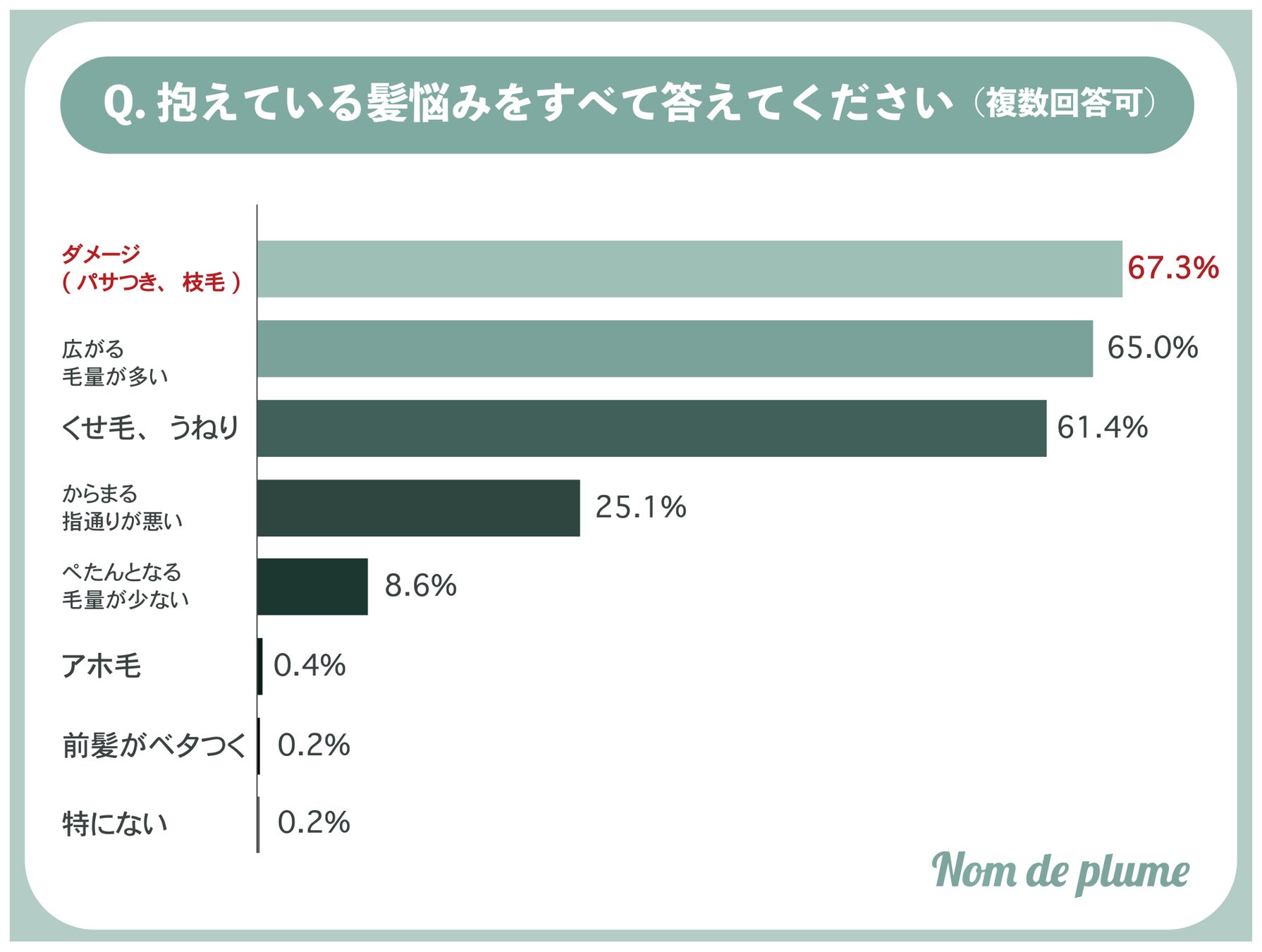 アンケートにて「抱えている髪悩みをすべて答えてください(複数回答可)」と尋ねたところ、『ダメージ(パサつき、枝毛)(67.3%)』と回答した方が最も多く、次いで『広がる、毛量が多い(65.0%)』『くせ毛、うねり(61.4%)』という結果となりました。