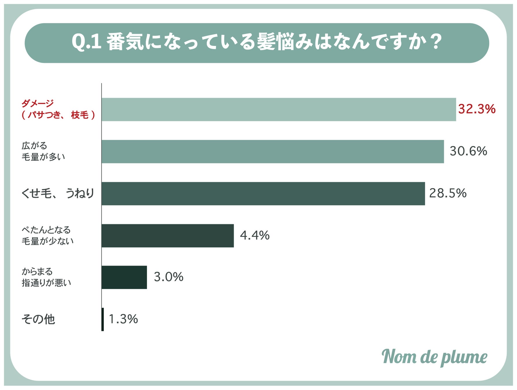 アンケートにて「1番気になっている髪悩みはなんですか?」と尋ねたところ、『ダメージ(パサつき、枝毛)(32.3%)』が最も多く、Z世代は髪のダメージによるパサつきや枝毛を特に気にしていることがわかりました。次に『広がる、毛量が多い(30.6%)』『くせ毛、うねり(28.5%)』と続く結果となりました。