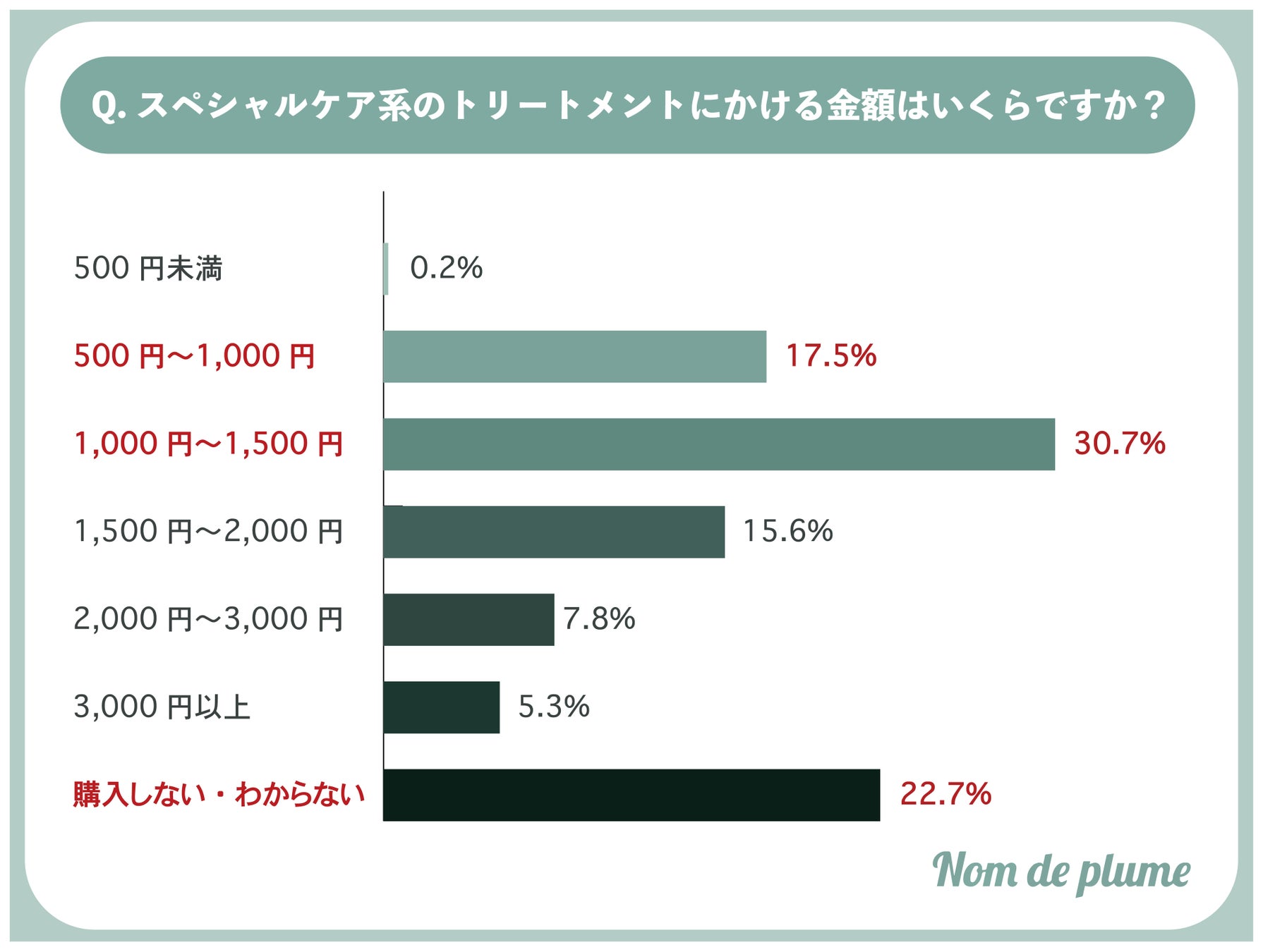アンケートにて「スペシャルケア系のトリートメントにかける金額はいくらですか?」と尋ねたところ、『1,000円〜1,500円(30.7%)』が最も多く、次いで『購入しない・わからない(22.7%)』『500〜1,000円(17.5%)』と続く結果になりました。