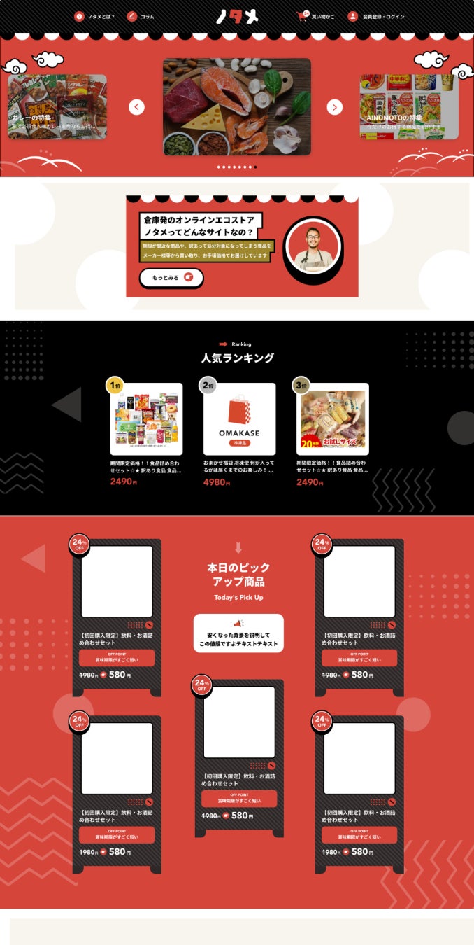 EC事業を運営していく上で検品の結果見つかった軽微な不良やキズ、サンプル品、お客様からの返品や輸送事故によるパッケージダメージなど、良品販売しにくい商品が発生した際に、返送先をイーロジスにしていただくことで、訳あり商品販売サイト「ノタメ」に掲載され、新たなお客様との出会いを創出します。御社のEC事業で発生する不良在庫をただ眠らせておくだけではなく、まだ見ぬお客様に使っていただく広告アイテムとして、有効活用できます。