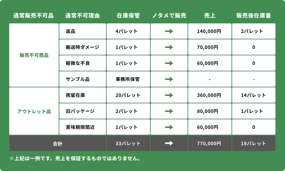 | 販売不可商品 | 軽微な不良 | 1パレット | → | 60,000円 | 0 |