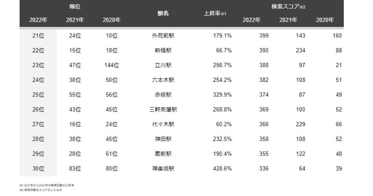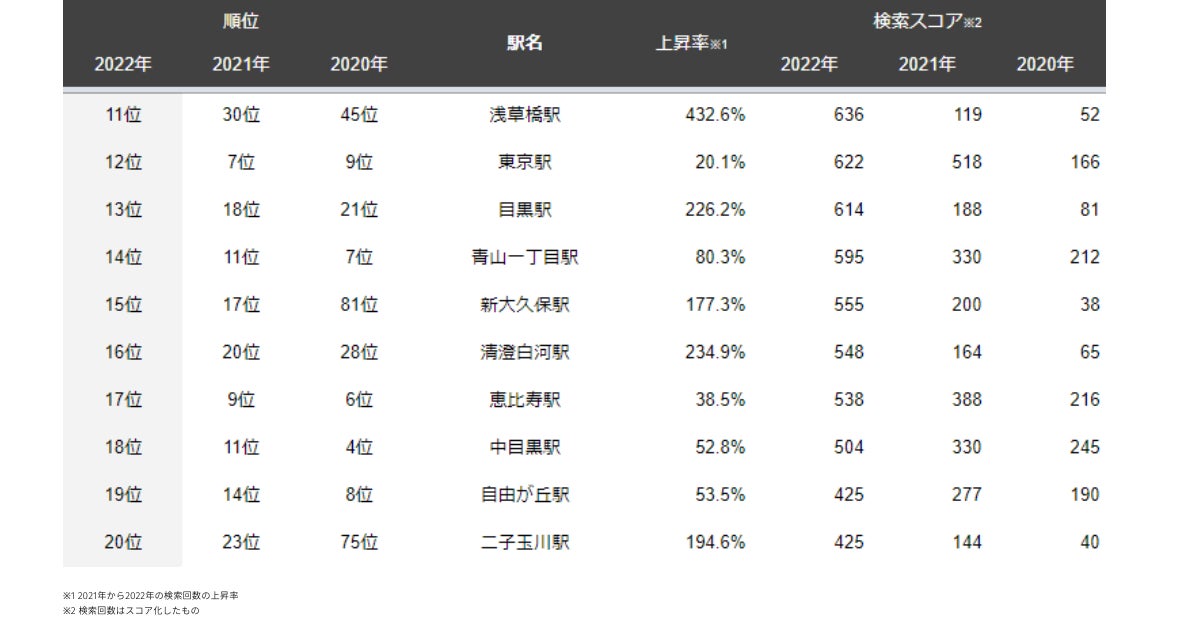 表参道駅、原宿駅、渋谷駅は、2020年の調査開始時から3年連続でトップ3位になります。また、検索スコアの量も4位以降の駅と差の開きも大きく、非常に高い人気を誇っています。