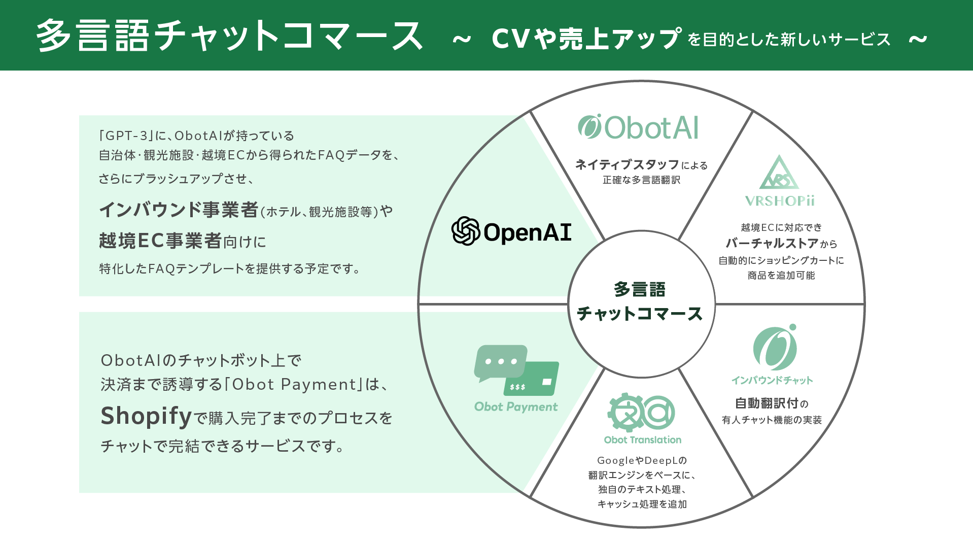 株式会社ObotAI(東京都港区、代表取締役社長:北見 好拡)は、多言語DXとして訪日外国人や越境EC事業者向けに、新しいサービスの提供を開始致します。インバウンド施設(宿泊施設や観光施設など)や越境ECサイト等に寄せられる、外国人からのお問い合わせに、多言語AIチャットボットや翻訳機能のついたライブチャットで顧客に対応します。また、ShopifyをはじめとしたECプラットフォームと連動してチャット上で決済ができる機能など、CV(コンバージョン)の向上を目的とした「多言語チャットコマース」を提供します。
