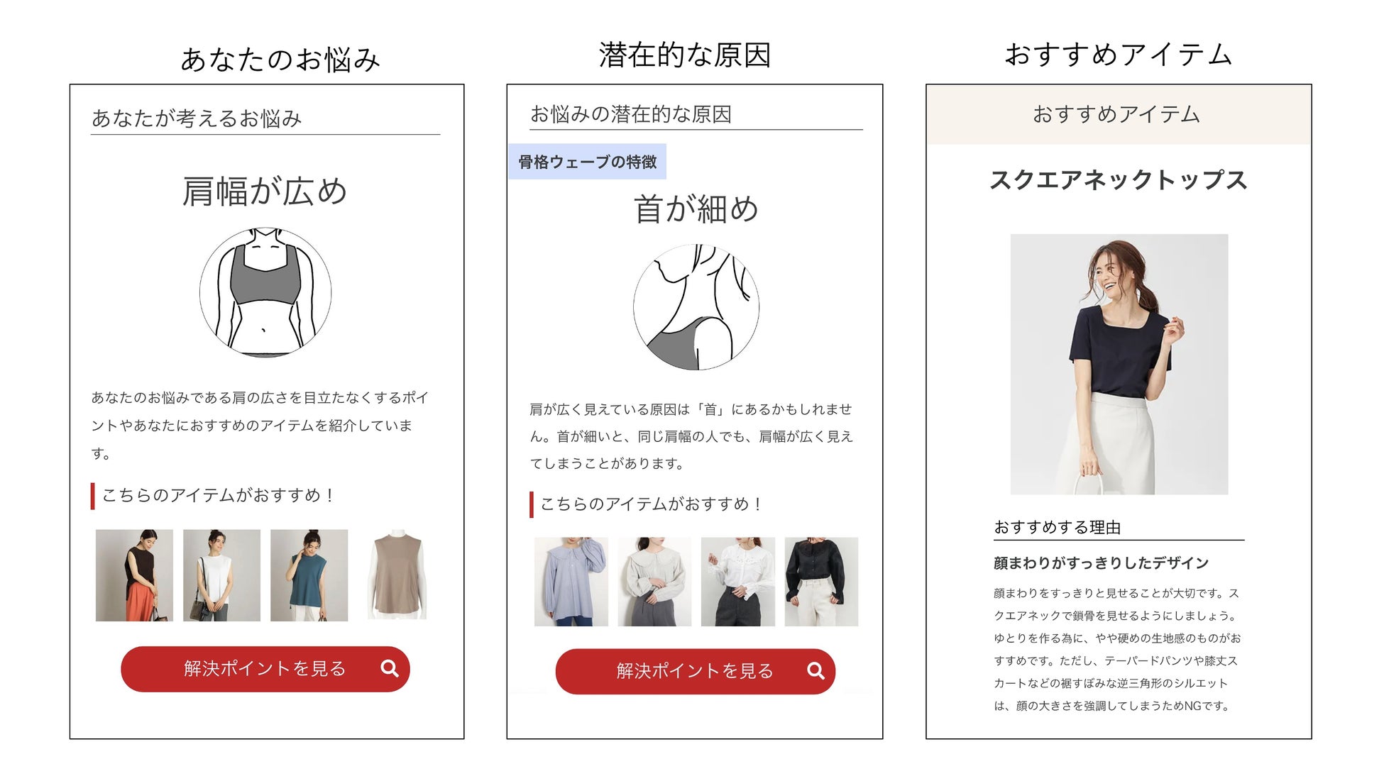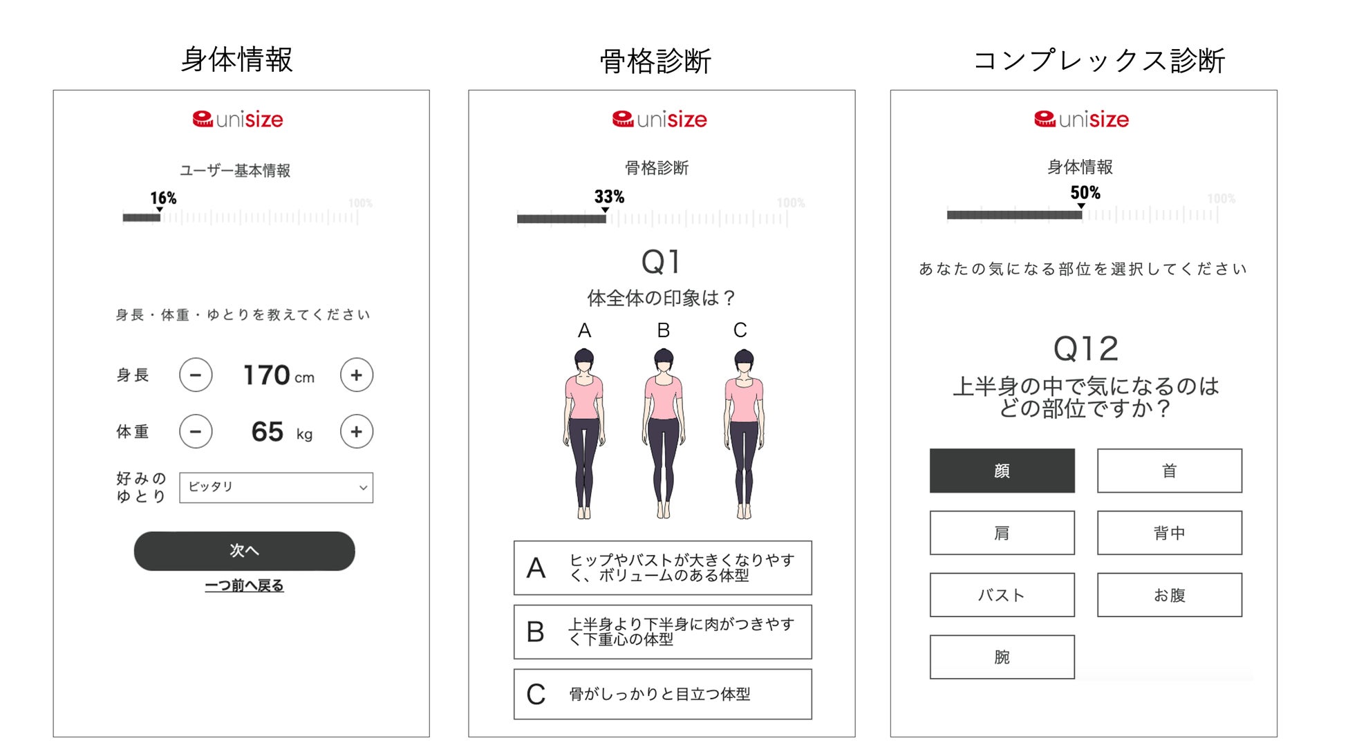 この診断を利用することにより、ユーザーは従来の骨格診断だけでは論理的に捉えられていなかった、骨格タイプや自身が考えるコンプレックスにあったカバー術だけでなく、今まで認識していなかった潜在的な体型の特徴を知ることができます。また、お悩み別に提案される解消に役立つ洋服を「unisize」内で取り扱っているファッションECサイトからまとめて探すことが可能となります。