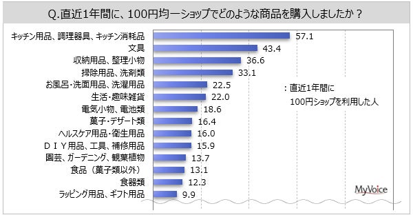 直近1年間に100円ショップで購入した商品は(複数回答)、「キッチン用品、調理器具、キッチン消耗品」が利用者の57.1%、「文具」が43.4%、「収納用品、整理小物」「掃除用品、洗剤類」が各30%台となっています。
