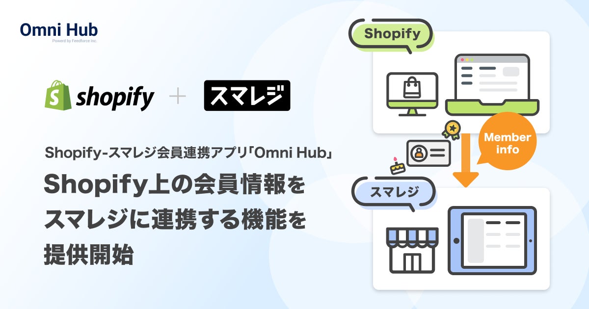 Shopify(ショッピファイ) – スマレジ間のオムニチャネル会員連携アプリ「Omni Hub」(株式会社フィードフォース、所在地:東京都文京区、代表取締役:塚田 耕司)は、「会員ランク」や「生年月日」などShopifyで開設したオンラインストア上に登録されている会員情報データをスマレジに連携できる機能を公開いたしました。