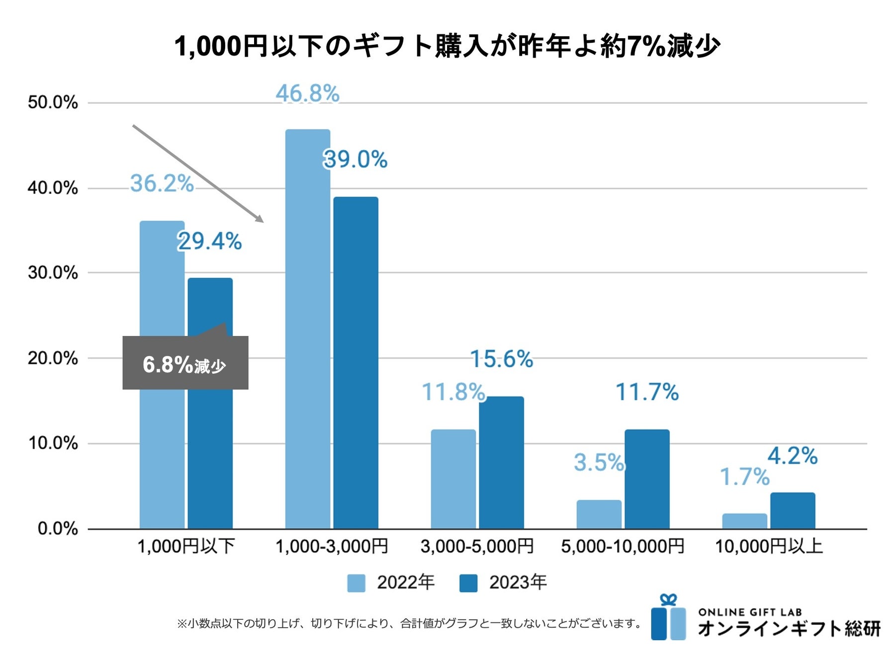 購入価格帯は「1,000-3,000円」が39.0%と最も多く、続いて「1,000円以下」が29.4%となったが、いずれも昨年よりも約7%減少している結果となりました。「1,000円以下」の割合が減少し3,000円以上の高単価が増えた理由として、以下3点が考えられます。