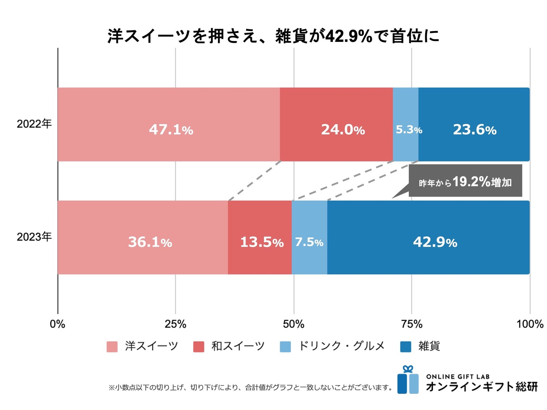 バレンタインギフトとして購入されている商品の全カテゴリを、洋スイーツ・和スイーツ・ドリンク/グルメ・雑貨に分類し、その構成割合を昨年と比較した結果、昨年47.1%だった洋スイーツに代わり、今年は雑貨が42.9%と半数に迫るシェアを占め首位となりました。