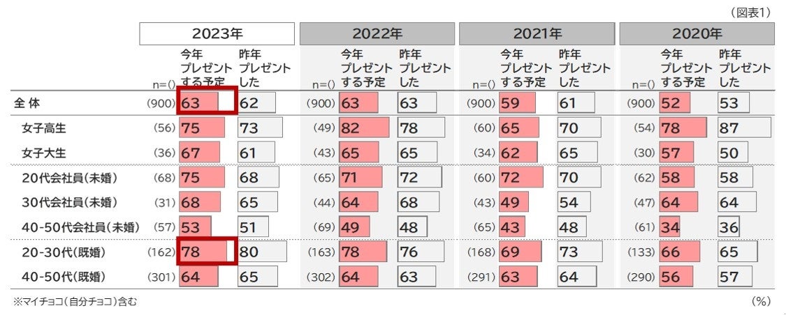 - 「今年チョコをプレゼントする予定あり」は63%で、昨年と同様。最も予定しているのは「20-30代(既婚)」で、78%が「渡す予定あり」と回答。