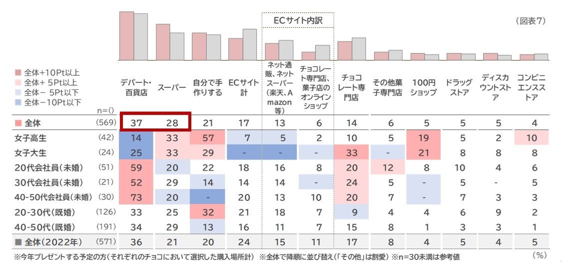 - 購入予定場所としては「デパート・百貨店」が全体で最も高く37%、次いで「スーパー」が28%となっています。昨年「デパート」に次いで2番目に高かった「ECサイト計」は17%にとどまっています。実店舗で購入したい気持ちもありつつ、お手頃感も求めている、そんな様子がうかがえます。(図表7)