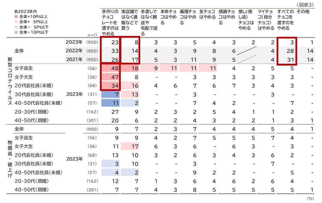 - 新型コロナウイルスの影響としてあてはまるものでは、2022年との比較では、「すべてのチョコを渡すのをやめる」「手作りのチョコレートを渡すのはやめる」等で、数値が下がっており、コロナの影響が薄れつつあるようです。とはいえ若年層では「手作りのチョコレートを渡すのはやめる」が、特に新型コロナウイルスによる影響を受けており、数値が高めとなっています。尚、最近の物価高や値上げラッシュは、いずれかのチョコをやめる等までへの影響は、それほど及ぼしていなそうです。(図表3)