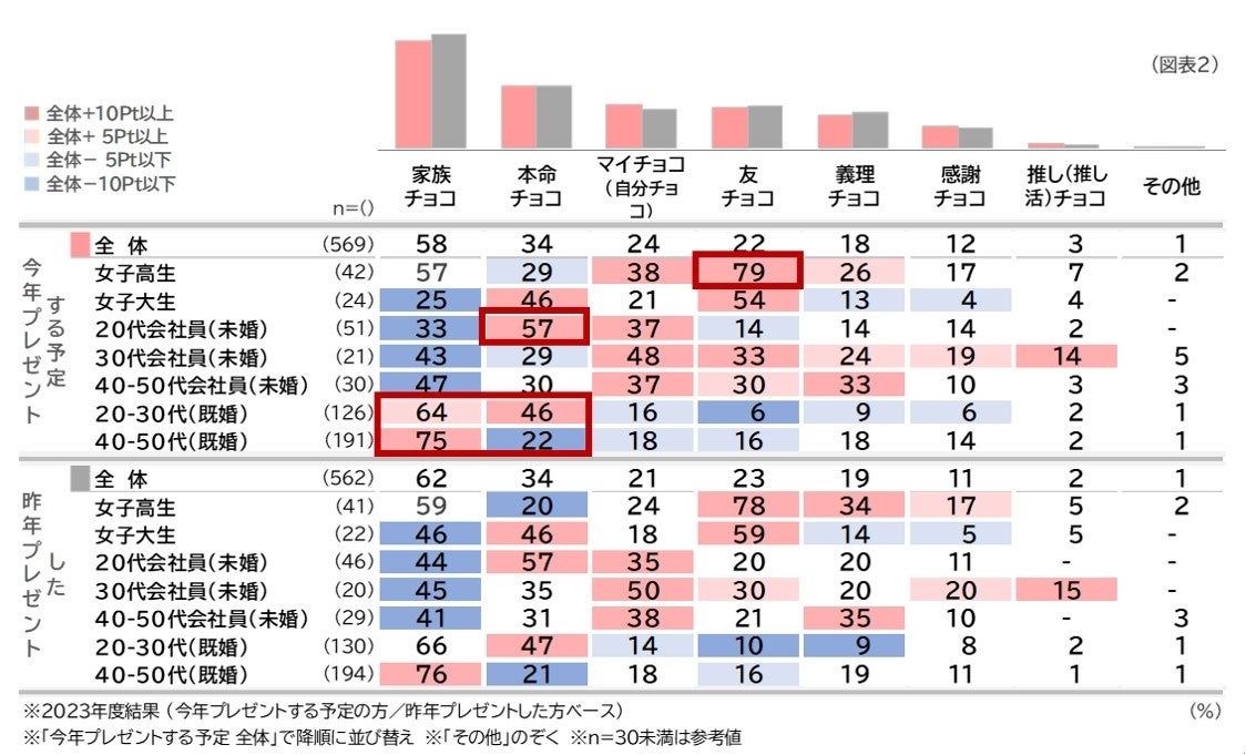 - コロナの影響が少なかったと考えられる2022年との比較では、属性間での差が縮まってきており、どの属性でも半数以上が「渡す予定あり」と回答。コロナ禍を経て、より多くの層で楽しむイベントに。