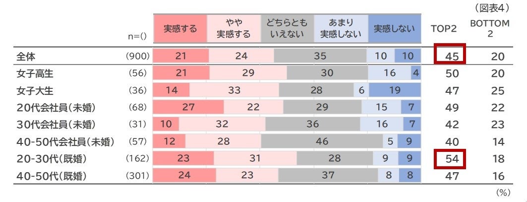 - 値上げを感じてはいるようで、全体の45%が「実感する」または「やや実感する」と回答しています。最も実感しているのは「20-30代(既婚)」でTOP2は54%となっています。(図表4)