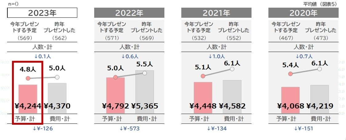 - 今年の予算計は平均4,244円で、これまでで最も低い数値に。プレゼントする予定の人数も平均4.8名と、初めて5.0名を下回る結果に。