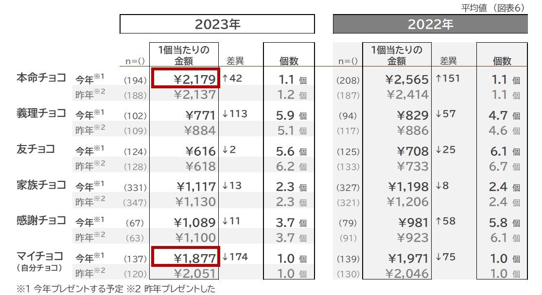 - 最も予算をかけるつもりなのは、2022年同様に、やはり「本命チョコ」で、1個当たりの金額は平均2,179円です。次いで「マイチョコ(自分チョコ)」が高く(同1,877円)、自分へのご褒美には予算をいとわない傾向も、引き続きみられます。2023年の傾向としては、「本命チョコ」を除き、「昨年プレゼントした」より価格は減少。外出の機会が増えたからなのか「義理チョコ」の個数自体は、5.9個プレゼントする予定と上昇していますが、価格は減少傾向で、バランスをとる形となっています。(図表6)