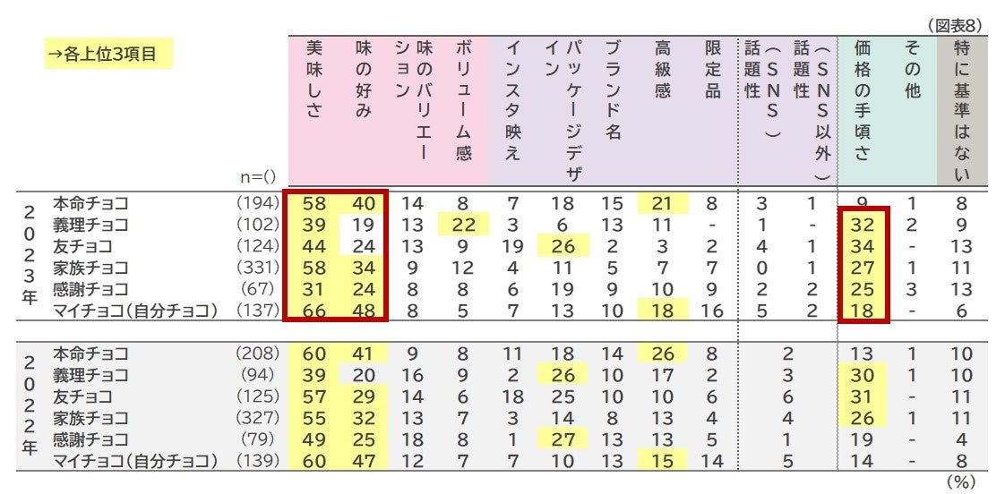 - 選ぶ基準としては、2022年までと同様、全体的に「美味しさ」「味の好み」が中心ですが、2022年にはやや減少傾向にあった「価格の手頃さ」が、全体的に数値が上昇しています( 「本命チョコ」を除く)。「高級感」は「マイチョコ(自分チョコ)」を除いて、減少傾向に。「義理チョコ」などは、よりわかりやすく「パッケージデザイン」より「ボリューム感」重視へと、昨年との比較では、身の丈消費への志向が見られます。(図表8)