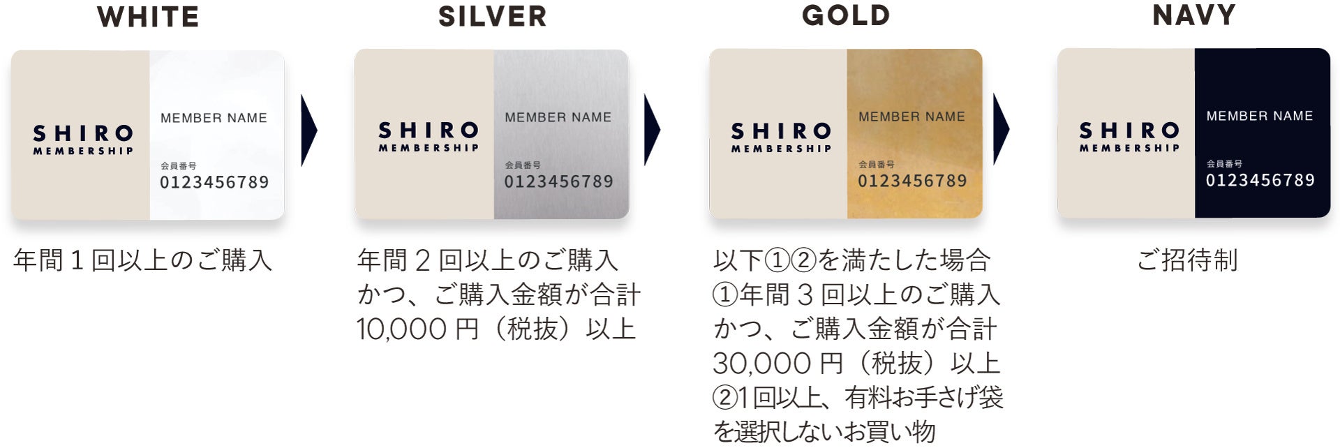 SHIRO 店舗もしくはオンラインストアでのご購入内容に応じて、会員ステージを付与させていただきます。