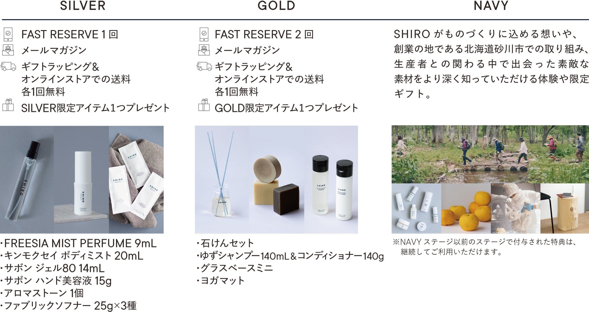 会員ステージごとにSHIRO ならではの特別な特典をお受け取りいただけます。