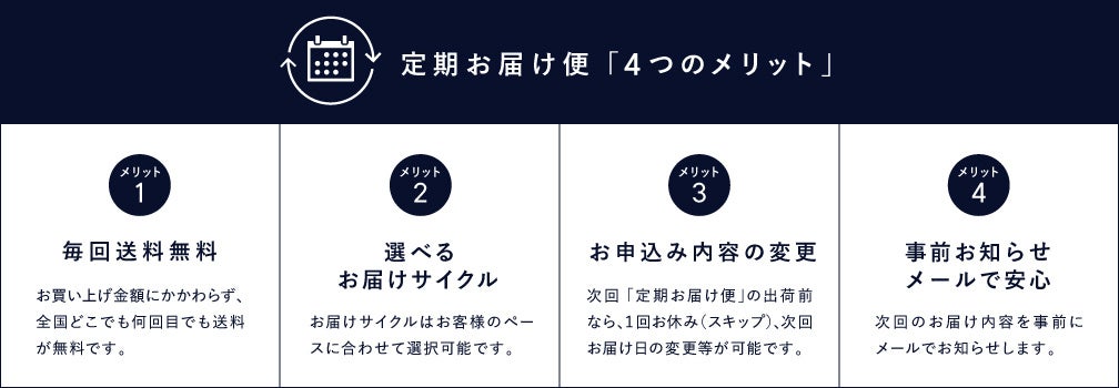 「定期お届け便」は、対象製品のリニューアルや生産終了により定期的なお届けを終了させていただくことがございます。そのような場合は事前にお知らせさせていただきます。