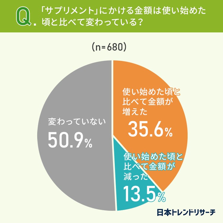 「増えた」が35.6%、「減った」が13.5%となっており、使い始めた頃よりもサプリメントにかける金額が増えた方のほうが多いようです。
