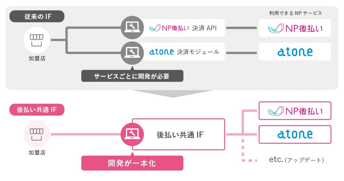 「後払い共通IF」は、当社の「NP後払い」「atone」のシステム接続に関する新仕様です。従来、当社の各種後払い決済サービスは、サービス単位でのシステム開発が必須となっていましたが、「後払い共通IF」により、「NP後払い」「atone」について一度の開発で両サービスとの接続が可能となります。