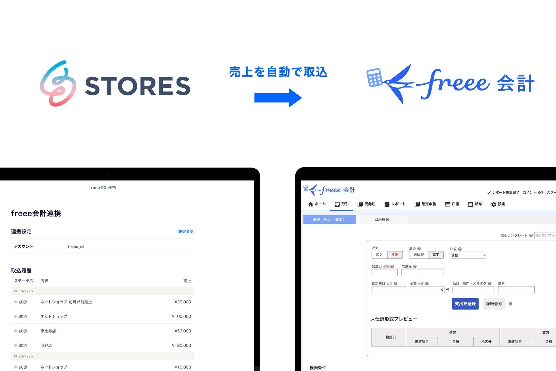 STORES 株式会社(以下、STORES)が運営するネットショップ開設サービス「STORES(ストアーズ)」とネットショップとひとつになったPOSレジアプリ「STORES レジ」は、freee株式会社(本社:東京都品川区、CEO:佐々木大輔)が提供するクラウド会計ソフト「freee会計」との連携機能を2023年2月15日(水)より提供開始しました。本連携により「STORES(ネットショップ)」「STORES レジ(※1)」の売上データがfreee会計へ自動で連携され、ネットショップと実店舗の運営における経理業務の負担を軽減します。さらに、2022年1月からの売上データ連携が可能になるため、2023年提出分の「確定申告」書類作成時にも活用が可能です。