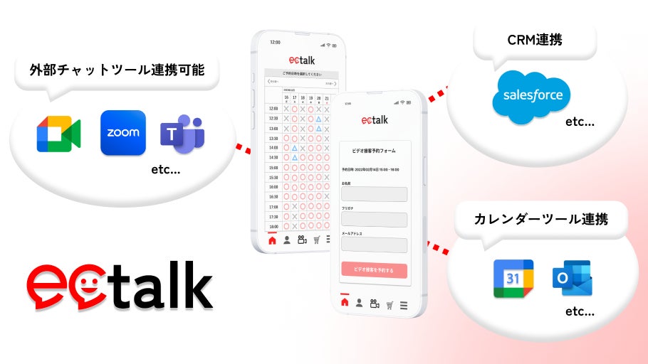 予約フォームでは、Google CalendarやMicrosoft Outlookなどのカレンダーツールと接続ができ、受けた予約時間のカレンダーへの自動入力や、接客スタッフのスケジュールを予約フォームに反映することが可能です。また、ビデオ接客時には、『ectalk』内のビデオチャット機能のほか、Google Meetやzoom、teamsなどの外部ビデオチャットツールを選択し、使用することができます。さらには、SalesforceをはじめとするCRM(顧客関係管理)ソリューションと連携し、『ectalk』から顧客情報を管理したり、接客スタッフ実績などを確認することができます。『ectalk』は各種外部ツールとの柔軟な連携が可能であるため、あらゆる事業者さまの業務フローに密着したご活用いただけます。