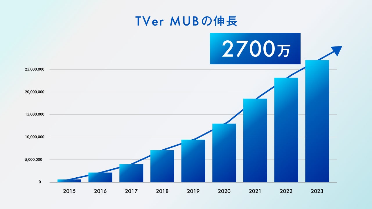 株式会社TVer(本社:東京都港区、代表取締役社長:若生伸子)は、民放公式テレビポータル「TVer (ティーバー)」の2023年1月における月間ユーザー数が2,700万MUB(※1)を突破し、2,708万の最高記録を更新したことをお知らせいたします。