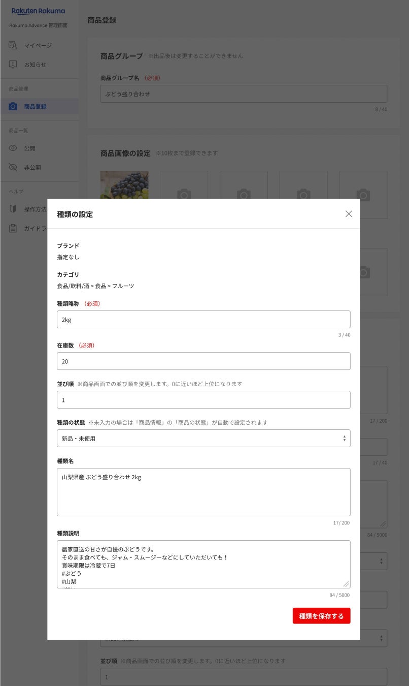 STEP3: 商品グループ、商品、種類、在庫数など、各項目の情報を入力します。