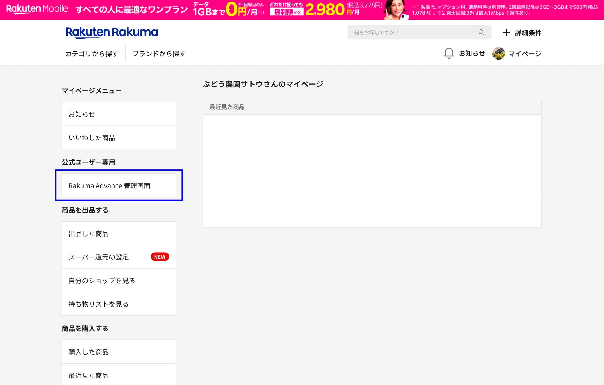 STEP1: 「楽天ラクマ」にログインし、画面左側のメニューの[Rakuma Advance 管理画面]を選びます。