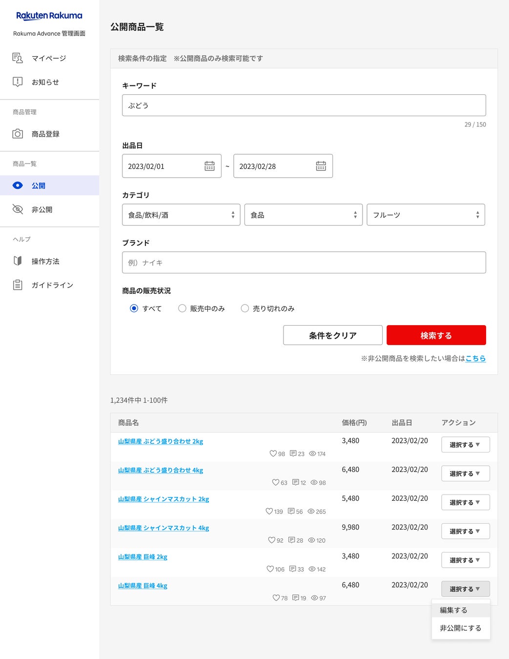 ・出品した商品を一覧画面で検索・参照できるようになりました