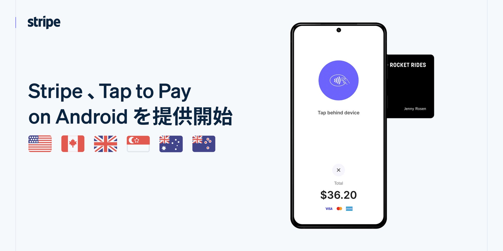 Stripe の Tap to Pay on Android は現在、米国、カナダ、英国、ニュージーランド、オーストラリア、シンガポールにおいて NFC 対応の Android スマートフォンまたはタブレットのベータ版で利用することが可能です。Google Pay などのモバイル決済のほか、Mastercard、Visa、American Express のデビッドカードやクレジットカードでの取引をサポートしています。