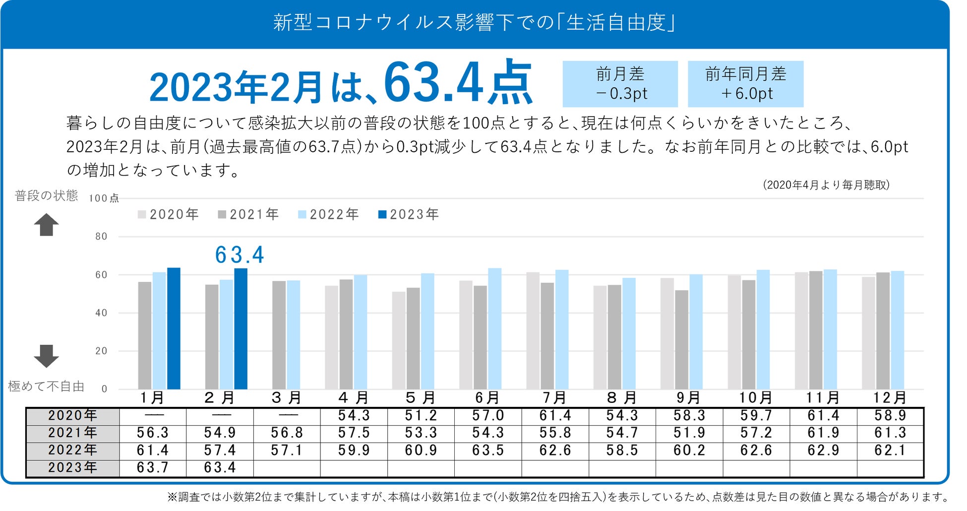 2月の「生活自由度」は63.4点で、前月並みの高い水準に。​