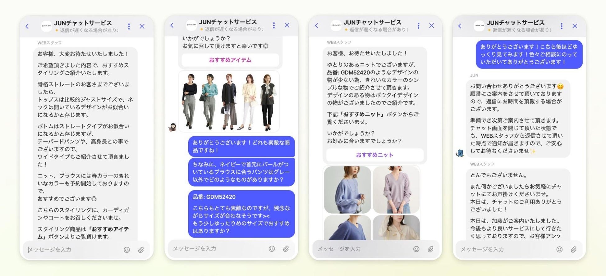 All-in-one顧客コミュニケーションツールの「チャネルトーク」(株式会社Channel Corporation、所在地:東京都中央区、CEO:玉川葉、以下「チャネルトーク」)は、株式会社ジュン(本社:東京都港区/代表取締役社長:佐々木進)が運営するECサイト「J'aDoRe JUN ONLINE(ジャドールジュンオンライン)、以下 ジュン」にチャネルトークを導入し、チャット接客を行い、転換率は実店舗並みの40%を記録し、アンケート調査では満足度驚異の85%を達成していることをお知らせします。